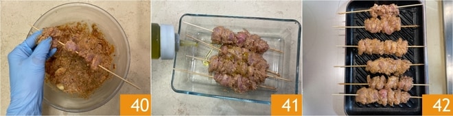 Nach der Marinierzeit könnt ihr die Spieße zusammenstellen: Spießt die Hähnchenstücke auf 6 Holzspieße, die ihr zuvor etwa zehn Minuten in Wasser eingeweicht habt (so werden sie nicht schwarz). Lasst zwischen den Stücken etwas Abstand, um eine gleichmäßige Garung zu gewährleisten 40. Sobald sie zusammengebaut sind, würzt die Spieße mit etwas Öl 41, dann legt sie auf einen gut heißen Grill 42.