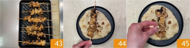 Grillt die Spieße 10-15 Minuten, indem ihr sie oft wendet 43. Ihr seid bereit, das Sandwich zusammenzustellen: Legt die Pita auf einen Teller und platziert einen Spieß in der Mitte 44, dann zieht das Fleisch ab und fügt ein paar geröstete Erdnüsse hinzu 45.