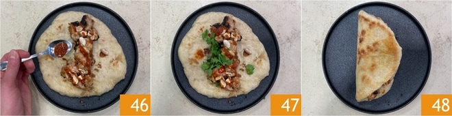 Würzt mit scharfer Soße nach Belieben 46, einem Spritzer Limette, ein paar Chiliringe und frischem Koriander, dann klappt sie in der Mitte zusammen 48. Macht weiter so, um die restlichen Pitas zusammenzustellen. Eure Hähnchenspieße mit Pita sind bereit, genossen zu werden!