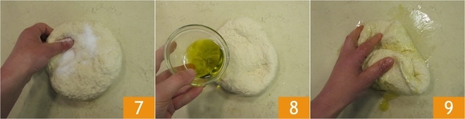 Breitet den Teig leicht aus und fügt das Salz hinzu 7, dann knetet weiter, bis ihr die Körner nicht mehr unter den Fingern spürt. Nachdem ihr das Salz eingearbeitet habt, macht dasselbe mit dem Öl, das ihr in 2-3 Portionen hinzufügt 8 9.