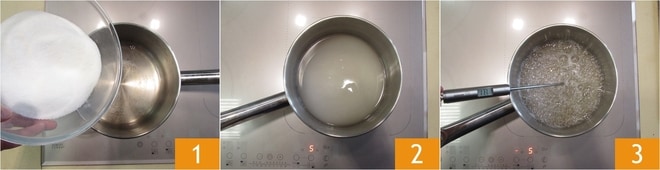 Um die Halbgefrorene Torte vorzubereiten, beginnen Sie mit dem Baiser. Geben Sie Wasser und Zucker in einen kleinen Topf, lassen Sie ein paar Esslöffel übrig 1. Erhitzen Sie bei mittlerer Flamme 2 und überwachen Sie ständig die Temperatur mit einem Küchenthermometer 3. Der Sirup muss 121° erreichen.