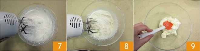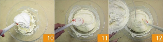 Fügen Sie dann nach und nach das Baiser hinzu 10, rühren Sie vorsichtig von unten nach oben 11. Am Ende fügen Sie die halbgeschlagene Sahne in drei Portionen hinzu, achten Sie darauf, sie nicht zu entmischen 12.