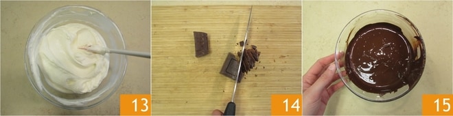 Sie sollten eine glatte, gut aufgeschlagene Mischung erhalten 13. Decken Sie sie mit Frischhaltefolie ab und stellen Sie sie bis zur Verwendung in den Kühlschrank. Jetzt kümmern Sie sich um die Schokolade: Hacken Sie 400 g Schokolade grob 14 und schmelzen Sie sie im Wasserbad oder in der Mikrowelle 15.