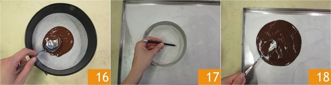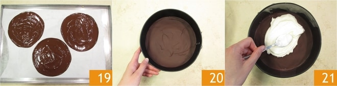 In der Zwischenzeit kleiden Sie eine Springform von 20 cm mit Backpapier am Boden und einem Streifen Acetat an den Rändern aus. Gießen Sie 4 Esslöffel Schokolade hinein und verteilen Sie sie mit dem Rücken eines Löffels auf dem gesamten Boden 16. Stellen Sie es in den Kühlschrank. Bereiten Sie jetzt die anderen Scheiben vor, insgesamt benötigen Sie 5. Zeichnen Sie mit einem Bleistift 5 Kreise von 18 cm auf Backpapier, indem Sie einen Tortenring zur Hilfe nehmen 17. Drehen Sie das Backpapier auf ein Blech und gießen Sie 2 Esslöffel Schokolade für jeden Kreis. Verteilen Sie die Schokolade immer mit dem Rücken des Löffels 18.