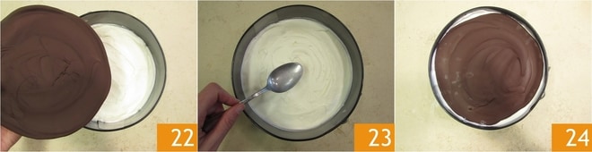 Legen Sie eine Schokoladenscheibe darauf 22 und fahren Sie auf diese Weise fort, indem Sie Ihre Creme 23 mit den Scheiben abwechseln. Sie sollten den Kuchen mit einer Schokoladenschicht beenden 24. Decken Sie ihn mit Frischhaltefolie ab und stellen Sie ihn für mindestens 6 Stunden in den Gefrierschrank.
