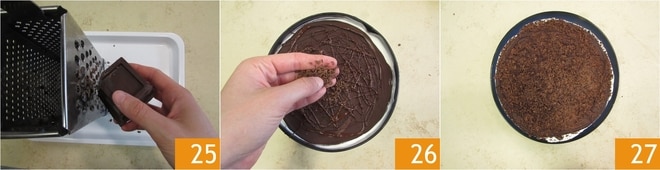 Reiben Sie die restlichen 100 g Schokolade 25. Wenn Sie noch mehr Schokolade übrig haben, gießen Sie sie mit einer Gabel über den Kuchen, falls sie fest geworden ist, können Sie sie erneut schmelzen. Fügen Sie die geriebene Schokolade hinzu 26, lösen Sie den Kuchen aus der Form, stellen Sie ihn auf einen Teller und servieren Sie die Halbgefrorene Torte 27.