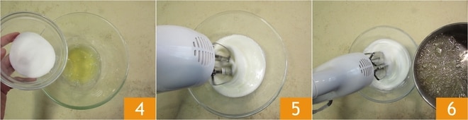 Wenn er 115° erreicht hat, können Sie beginnen, das Eiweiß zu schlagen. Geben Sie es in eine Schüssel, fügen Sie den restlichen Zucker hinzu 4 und schlagen Sie es mit einem elektrischen Mixer 5, bis es fest ist. Sobald der Sirup 121° erreicht hat, gießen Sie ihn langsam in das Eiweiß, während der Mixer in Betrieb ist 6.