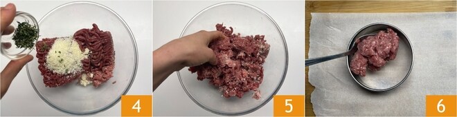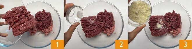 Um die Hamburger in der Heißluftfritteuse zuzubereiten, vermengen Sie das Hackfleisch von Rind und Schwein in einer Schüssel 1, fügen Sie dann das Salz 2, den Pfeffer und den geriebenen Grana Padano DOP 3 hinzu.