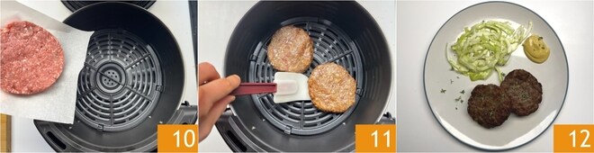 Legen Sie die Hamburger mithilfe des Backpapiers in eine Heißluftfritteuse (wir haben eine Fritteuse mit einem Fassungsvermögen von 6 Litern verwendet), dann entfernen Sie es 10. Garen Sie 2 Hamburger gleichzeitig bei 200 Grad für 10 Minuten und wenden Sie sie zur Hälfte der Garzeit 11. Ihre Hamburger in der Heißluftfritteuse sind bereit, wie Sie möchten, genossen zu werden 12!