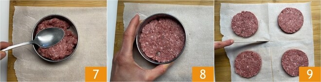 Verdichten Sie das Fleisch mit dem Rücken eines Löffels oder mit einem Fleischklopfer, je nach gewünschter Konsistenz 7. Ziehen Sie den Servierring vorsichtig ab 8 und verfahren Sie genauso, um die anderen 3 Hamburger zu formen. Schneiden Sie nun das Backpapier in Quadrate, um die Hamburger einfacher handhaben zu können 9.