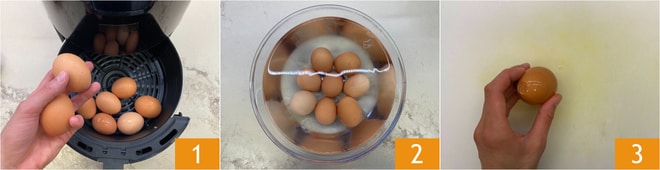 Um die hartgekochten Eier in der Heißluftfritteuse zuzubereiten, heizen Sie zuerst die Fritteuse auf 130° vor (wir haben eine Fritteuse mit einem Fassungsvermögen von 6 Litern verwendet). Dann legen Sie die Eier in den Korb 1 und kochen sie für 15 Minuten. Nehmen Sie die Eier heraus und lassen Sie sie in kaltem Wasser 2 oder alternativ in Wasser mit Eis abkühlen. Sobald sie abgekühlt sind, schlagen Sie den oberen und unteren Teil 3.