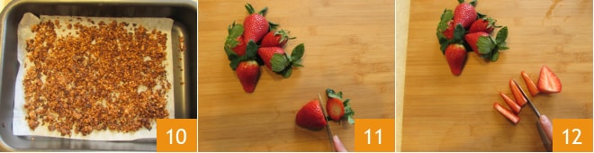 und backt sie im vorgeheizten statischen Ofen bei 180°, für 10 Minuten: Am Ende des Backvorgangs werden sie schön gefärbt sein 10. Macht weiter mit den Erdbeeren: Entfernt die grünen Blätter und den Stiel 11, dann schneidet sie je nach Größe in Stücke: Bei großen Erdbeeren solltet ihr 8 gleiche Stücke erhalten 12.