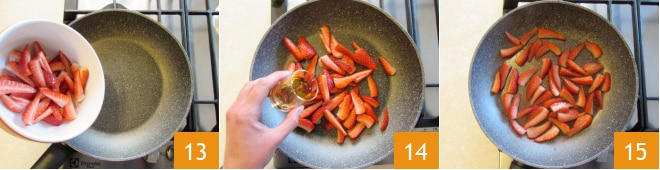 Gebt die Erdbeeren in eine Pfanne 13. Schaltet die Flamme ein und sobald der Boden heiß ist, löscht mit dem Rum ab 14 und lasst ihn verdampfen. Insgesamt dauert es nicht mehr als 2-3 Minuten. Die Erdbeeren sollten nämlich schön knackig bleiben 15.