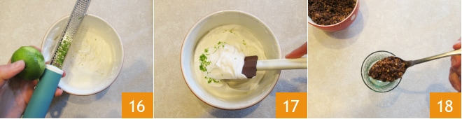 Während die Erdbeeren abkühlen, holt die Creme aus dem Kühlschrank, reibt die Limettenschale 16 und mischt sehr vorsichtig 17. Ihr seid bereit für die Zusammensetzung der 4 Portionen. Gebt ein wenig Haselnuss-Crumble auf den Boden der Gläser 18