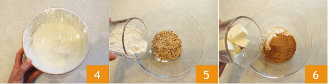 Sobald ihr eine weiche und kompakte Creme habt, deckt sie mit Frischhaltefolie ab und lasst sie etwa zehn Minuten im Kühlschrank ruhen 4. In der Zwischenzeit kümmert euch um das Crumble. Gebt die Haselnussgranulat, das Mehl 5, den Zucker und die weiche Butter in Stücken 6 in eine Schüssel,