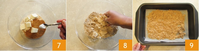zum Schluss das Salz 7 und zerbröselt die Mischung schnell mit den Fingerspitzen 8. Gebt die Krümel auf ein mit Backpapier ausgelegtes Backblech 9