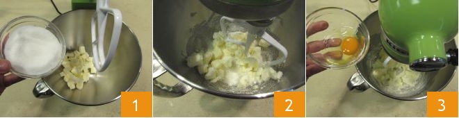 Um die Haselnuss-Damenküsse zuzubereiten, geben Sie die auf Raumtemperatur gebrachte und zuvor in Würfel geschnittene Butter in die Schüssel einer Küchenmaschine mit Rührwerk. Fügen Sie dann den Kristallzucker hinzu 1, stellen Sie die Maschine auf niedrige Geschwindigkeit 2 und verarbeiten Sie alles etwa zehn Minuten lang. Wenn Sie eine leicht aufgeschlagene Creme erhalten haben, geben Sie das Ei hinzu 3 und lassen Sie es vollständig einarbeiten.
