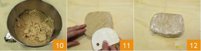 Erst wenn Sie eine gleichmäßige Masse erhalten haben 10, übertragen Sie sie auf eine leicht bemehlte Oberfläche und bearbeiten Sie sie mit den Händen oder einem Schaber, um sie nicht zu stark zu erhitzen, bis sie die Form eines Teigblocks annimmt 11. Wickeln Sie diesen in Frischhaltefolie 12 und stellen Sie ihn für mindestens 1 Stunde in den Kühlschrank, um ihn fest werden zu lassen.