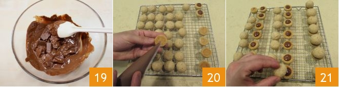 Sobald Sie sie aus dem Ofen genommen haben 16 legen Sie die Kugeln auf ein Gitter 17 und lassen Sie sie vollständig auskühlen. In der Zwischenzeit kümmern Sie sich um die Füllung: Nehmen Sie die Gianduja-Schokolade und schneiden Sie sie in Würfel 18,