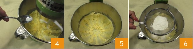 Nun fügen Sie das Salz hinzu 4, arbeiten noch einige Minuten weiter und schalten die Küchenmaschine für einen Moment aus 5. Sieben Sie das Mehl 00 direkt in die Schüssel,