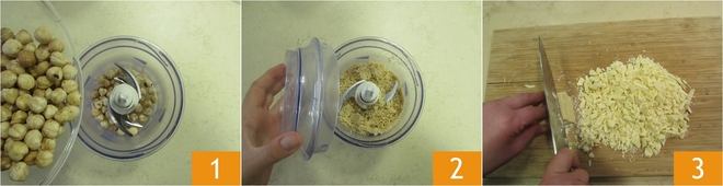 Bereiten Sie zuerst die Haselnuss-Namelaka vor. Geben Sie die Haselnüsse in einen Mixer 1 und pürieren Sie sie fein bis zu einem Mehl 2. Hacken Sie die weiße Schokolade und schmelzen Sie sie im Wasserbad oder in der Mikrowelle.