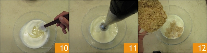 Rühren Sie mit einem Spatel um 10 und emulgieren Sie mit einem Stabmixer 11. Fügen Sie nun auch die fein gehackten Haselnüsse hinzu 12.