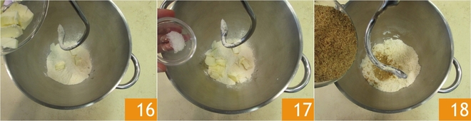 In der Zwischenzeit den Mürbeteig zubereiten: Geben Sie in die Schüssel der Küchenmaschine das Mehl und die kalte Butter in Stücken 16. Mischen Sie die Zutaten mit dem Knethaken, bis Sie einen sandigen Teig erhalten. Fügen Sie das Salz 17 und das Haselnussmehl hinzu 18.