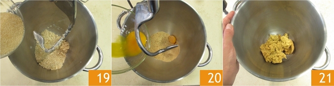 Fügen Sie auch den braunen Zucker hinzu 19 und arbeiten Sie die Zutaten einige Sekunden. Geben Sie auch die Eigelbe in die Schüssel 20 und arbeiten Sie alles, bis Sie einen weichen und homogenen Teig erhalten 21.