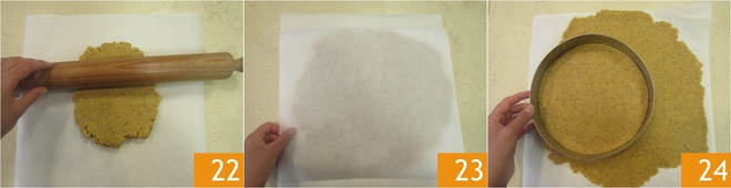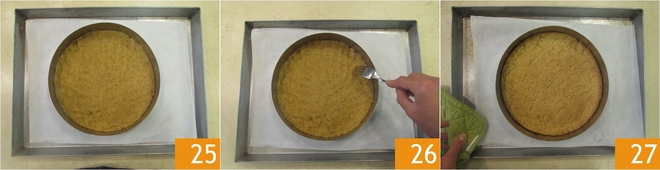 Übertragen Sie Form und Mürbeteigbasis auf ein mit Backpapier ausgelegtes Blech 25 und stechen Sie sie mit den Zinken einer Gabel ein. Backen Sie sie bei 180°C im vorgeheizten Umluftofen für 15/20 Minuten, bis sie gut trocken und goldbraun ist. Nehmen Sie die Basis aus dem Ofen 27 und lassen Sie sie abkühlen.
