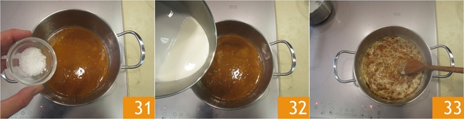 Fügen Sie dann das Salz 31 und die heiße Sahne langsam hinzu. Gut umrühren 33.