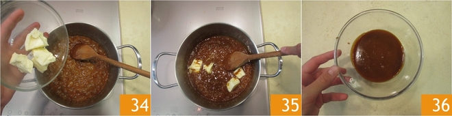 Wenn das Karamell gleichmäßig ist, schalten Sie die Hitze aus und fügen die kalte Butter in Stücken hinzu 34. Rühren Sie weiter, bis sie vollständig geschmolzen ist. Sobald es fertig ist, geben Sie das Salzkaramell in eine kleine Schüssel 36.
