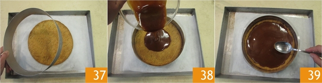 Nehmen Sie den abgekühlten Mürbeteig und entfernen Sie vorsichtig den Ring 37. Bedecken Sie ihn mit einem Blatt Acetatfolie und platzieren Sie die Mürbeteigscheibe wieder hinein. Gießen Sie das Salzkaramell in die Mitte 38 und verteilen Sie es mit einem Löffel, sodass ein Rand von 1 cm frei bleibt 39. Stellen Sie es beiseite bei Raumtemperatur.