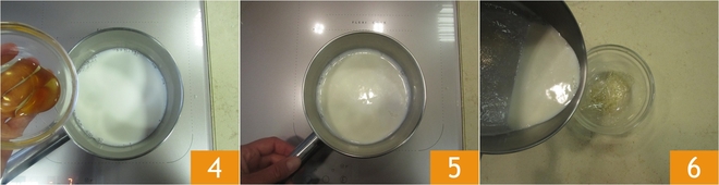 Geben Sie Milch und Honig in einen kleinen Topf 4 und erhitzen Sie es 5. Weichen Sie in der Zwischenzeit die Gelatine in kaltem Wasser ein. Sobald die Milch fast kocht, gießen Sie einen kleinen Teil in eine Schüssel, in der Sie die ausgedrückte Gelatine platziert haben 6.