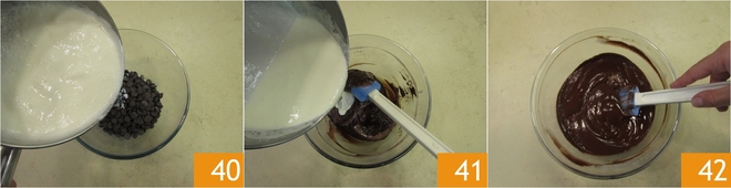 Bereiten Sie die Ganache zu: Erhitzen Sie die Sahne in einem kleinen Topf und hacken Sie währenddessen die Schokolade fein und geben Sie sie in eine große Schüssel. Sobald die Sahne kocht, gießen Sie ein Drittel davon über die Schokolade 40 und rühren Sie um. Fügen Sie noch etwas Sahne hinzu und rühren Sie erneut 41. Geben Sie den letzten Teil der Sahne hinzu und rühren Sie, bis Sie eine glatte Creme erhalten 42.