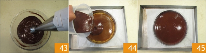 Mischen Sie alles mit einem Stabmixer, ohne Luft einzuschließen 43. Gießen Sie die mittlerweile abgekühlte Ganache in den Ring mit dem Mürbeteig und dem Salzkaramell 44. Stellen Sie die Tarte nun für mindestens 30 Minuten in den Kühlschrank 45 oder bis die Ganache fest geworden ist.