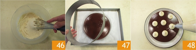 Nun bleibt Ihnen nur noch, die Tarte zu dekorieren. Nehmen Sie die Namelaka, arbeiten Sie sie mit einem Schneebesen 46, bis sie wieder glatt ist. Teilen Sie sie in zwei Spritzbeutel mit glattem Aufsatz, einen mit 10 mm und einen mit 15 mm. Nehmen Sie die Tarte aus dem Kühlschrank, entfernen Sie den Ring 47 und entfernen Sie vorsichtig den Acetatstreifen. Dekorieren Sie die Oberfläche, indem Sie größere Tupfen machen 48.