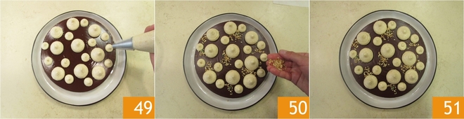 Machen Sie dann kleinere Namelaka-Tupfen 49. Dekorieren Sie mit karamellisierten Haselnussstückchen 50 und Thymianblättchen. Stellen Sie die Haselnuss-, Schokoladen- und Salzkaramell-Tarte bis zum Servieren in den Kühlschrank 51.