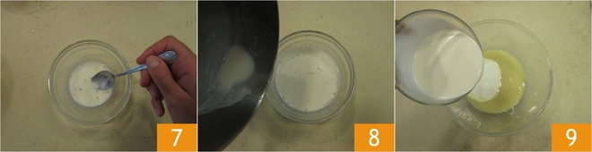 Rühren Sie, um sie aufzulösen 7, dann geben Sie sie zurück in den kleinen Topf und mischen Sie. Gießen Sie die warme Milch über die geschmolzene Schokolade 8 und vermischen Sie alles gut. Schließlich fügen Sie die kalte Sahne in einem dünnen Strahl hinzu 9.