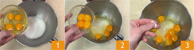Beginnen Sie mit der Zubereitung des gefüllten Haselnuss-Schokoladenkuchens, indem Sie die ganzen Eier und den Zucker in die Schüssel der Küchenmaschine geben (alternativ können Sie ein elektrisches Handrührgerät und eine große Schüssel verwenden) 1. Geben Sie auch die Eigelbe 2 und eine Prise Salz hinzu 3