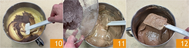 Auf diese Weise können Sie mit dem Spatel mischen, indem Sie sanfte Bewegungen von unten nach oben machen und die Bildung von Klumpen vermeiden 10. Fügen Sie dann den zweiten Teil der Mischung hinzu 11 und erhalten Sie einen glatten Teig 12.