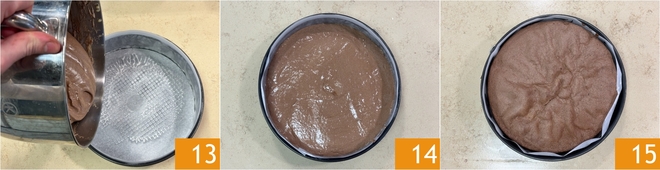 Gießen Sie den Teig in die gefettete Springform mit 26 cm Durchmesser, die mit Backpapier ausgelegt ist 13, glätten Sie die Oberfläche und backen Sie ihn im vorgeheizten statischen Ofen bei 180 °C für etwa 30-35 Minuten; machen Sie den Stäbchentest am Ende der Backzeit 14. Lassen Sie den Kuchen vollständig abkühlen, wenn er fertig ist 15.