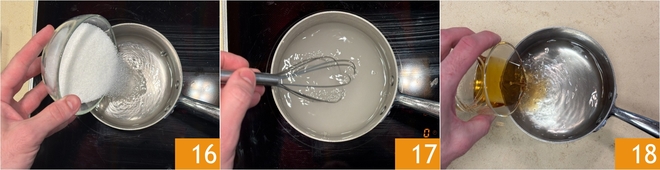 Bereiten Sie die Tränke vor. Geben Sie Wasser und Zucker in einen kleinen Topf 16, rühren Sie um und bringen Sie es zum Kochen 17. Dann schalten Sie den Herd aus, lassen Sie es abkühlen und fügen Sie den Rum hinzu; die Tränke ist fertig 18.