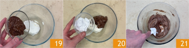Bereiten Sie nun die Füllung vor. Geben Sie in eine Schüssel den Mascarpone, die Haselnusscreme 19 und den Puderzucker 20 und arbeiten Sie mit dem Spatel, um die Mischung gleichmäßig zu verteilen 21.