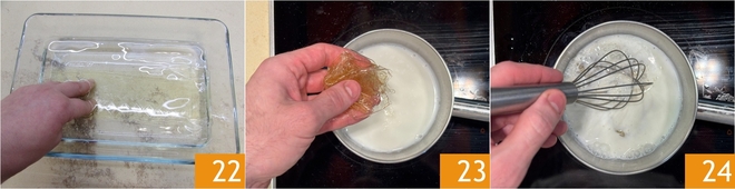 Legen Sie die Gelatine für 10 Minuten in kaltem Wasser ein 22. Erwärmen Sie die Milch in einem kleinen Topf, fügen Sie die eingeweichte und ausgedrückte Gelatine hinzu 23, schalten Sie den Herd ein und rühren Sie, bis sie sich auflöst 24, dann schalten Sie den Herd aus und lassen Sie sie 5 Minuten abkühlen.