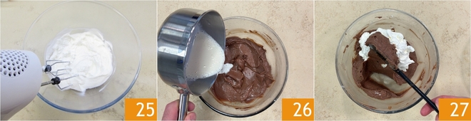 Schlagen Sie nun die frische Sahne mit dem elektrischen Handrührgerät auf 25. Geben Sie die abgekühlte Milch in die Mascarpone- und Haselnussmischung 26, rühren Sie gut um 26 und fügen Sie dann die geschlagene frische Sahne hinzu; heben Sie sie vorsichtig mit Bewegungen von unten nach oben unter 27.