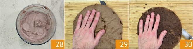 Stellen Sie die Creme im Kühlschrank beiseite 28 und nehmen Sie den inzwischen abgekühlten Kakaobiskuit. Schneiden Sie die Oberseite ab 29 und teilen Sie den Kuchen in zwei Hälften 30.