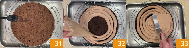 Bestreichen Sie den Boden mit der Tränke 31 und füllen Sie ihn mit etwas mehr als der Hälfte der Creme, die Sie in einen Spritzbeutel gefüllt haben 32. Glätten Sie die Creme, um sie gleichmäßig zu verteilen 33.