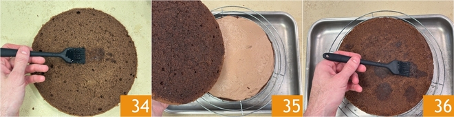 Nehmen Sie die zweite Scheibe, tränken Sie sie 34 und drehen Sie sie auf die gefüllte Seite 35, dann tränken Sie auch die Oberfläche: stellen Sie ihn in den Kühlschrank und kümmern Sie sich um die Glasur 36.