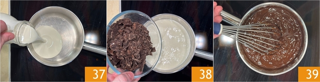 Erwärmen Sie die Sahne in einem kleinen Topf 37, wenn sie zu kochen beginnt, schalten Sie den Herd aus und fügen Sie die gehackte Schokolade hinzu 38. Rühren Sie, bis sie vollständig geschmolzen ist 39.
