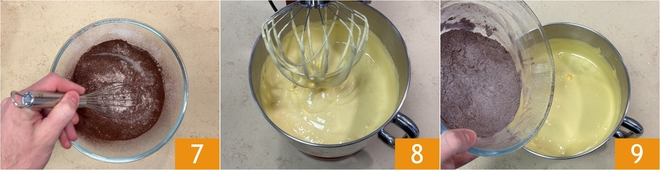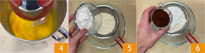 Schlagen Sie die Mischung mindestens 10 Minuten lang oder bis sie hell und schaumig ist 4. In der Zwischenzeit Mehl und Stärke in einer Schüssel sieben 5 und auch den Kakaopulver hinzufügen 6